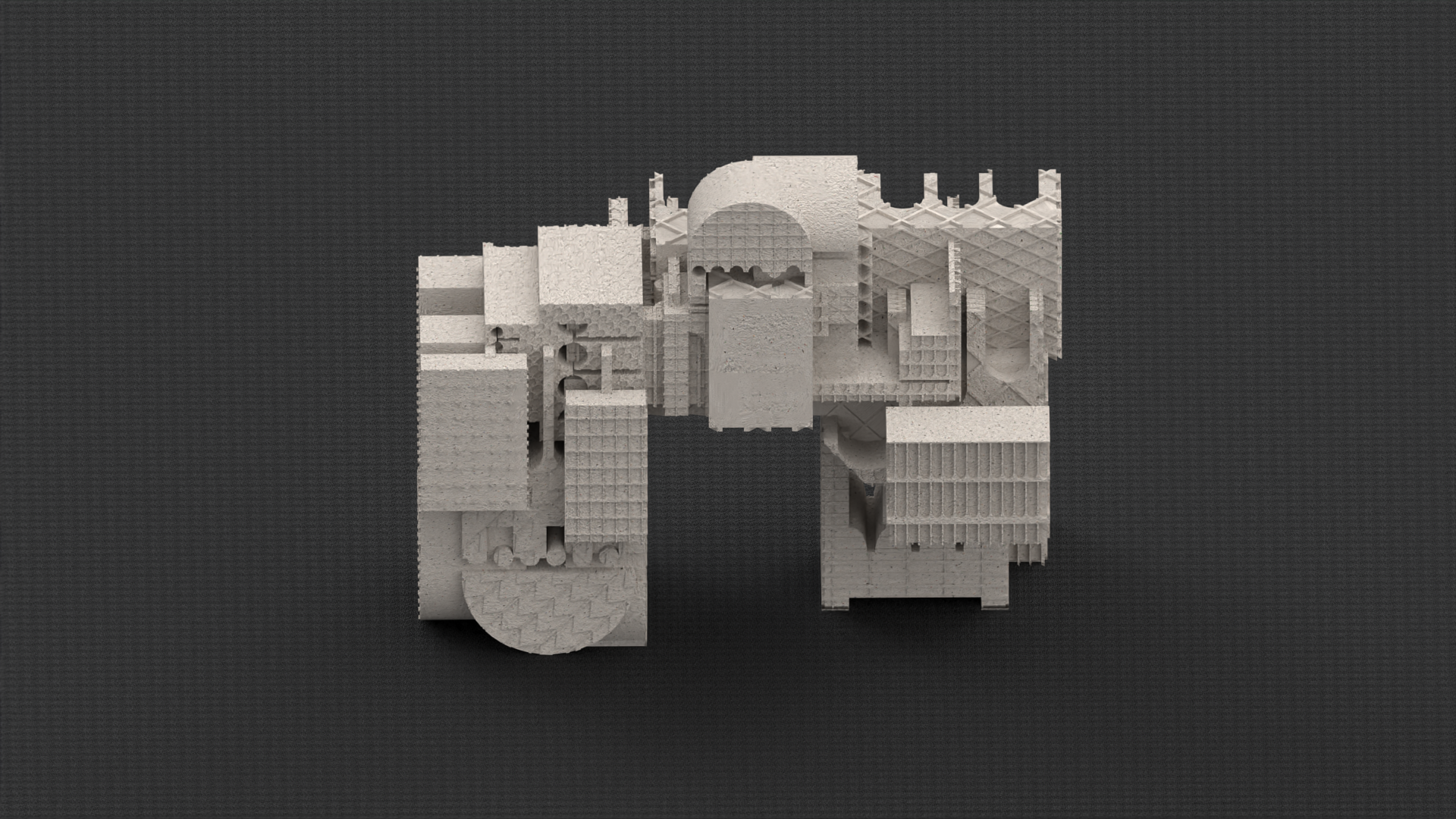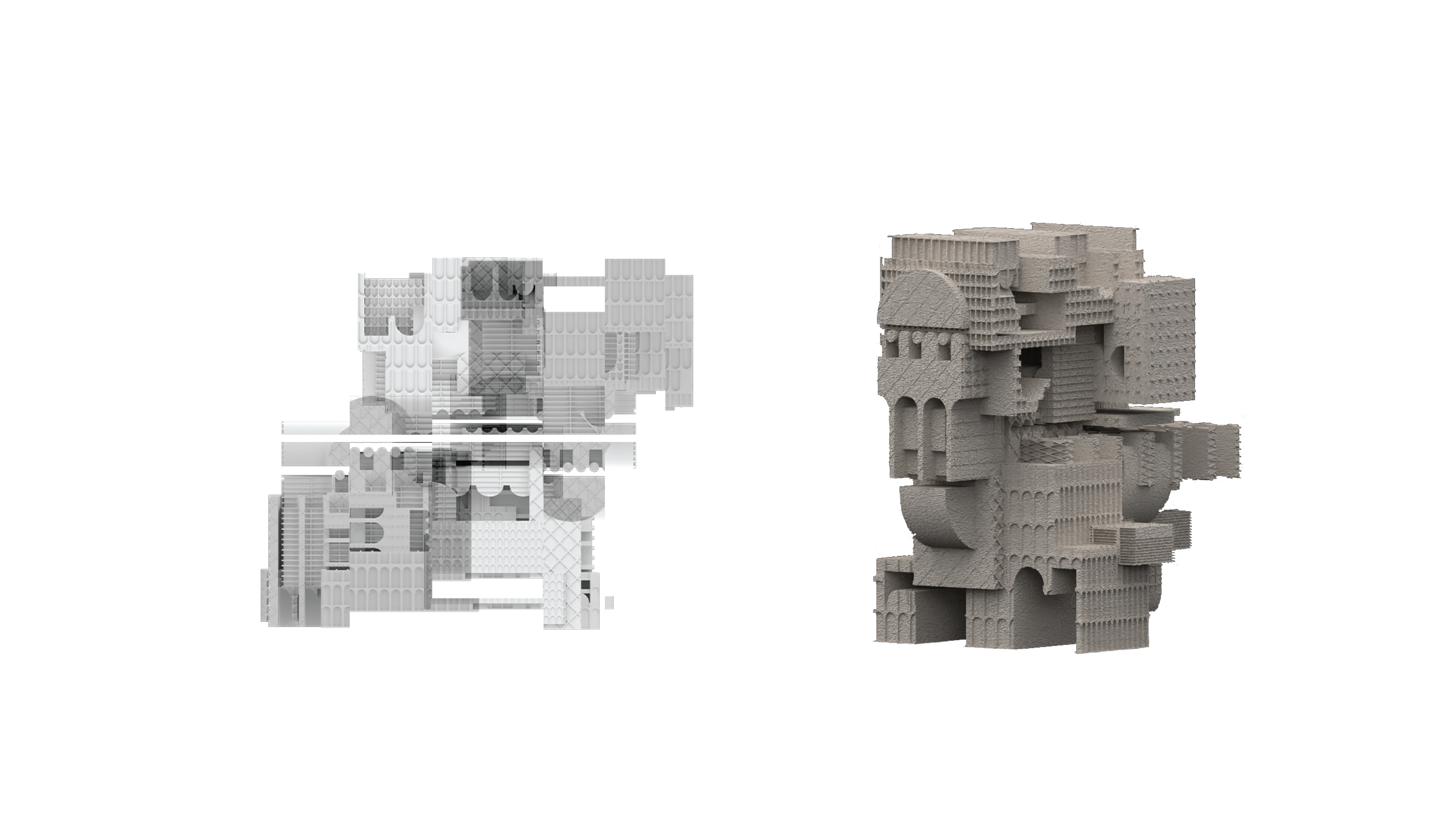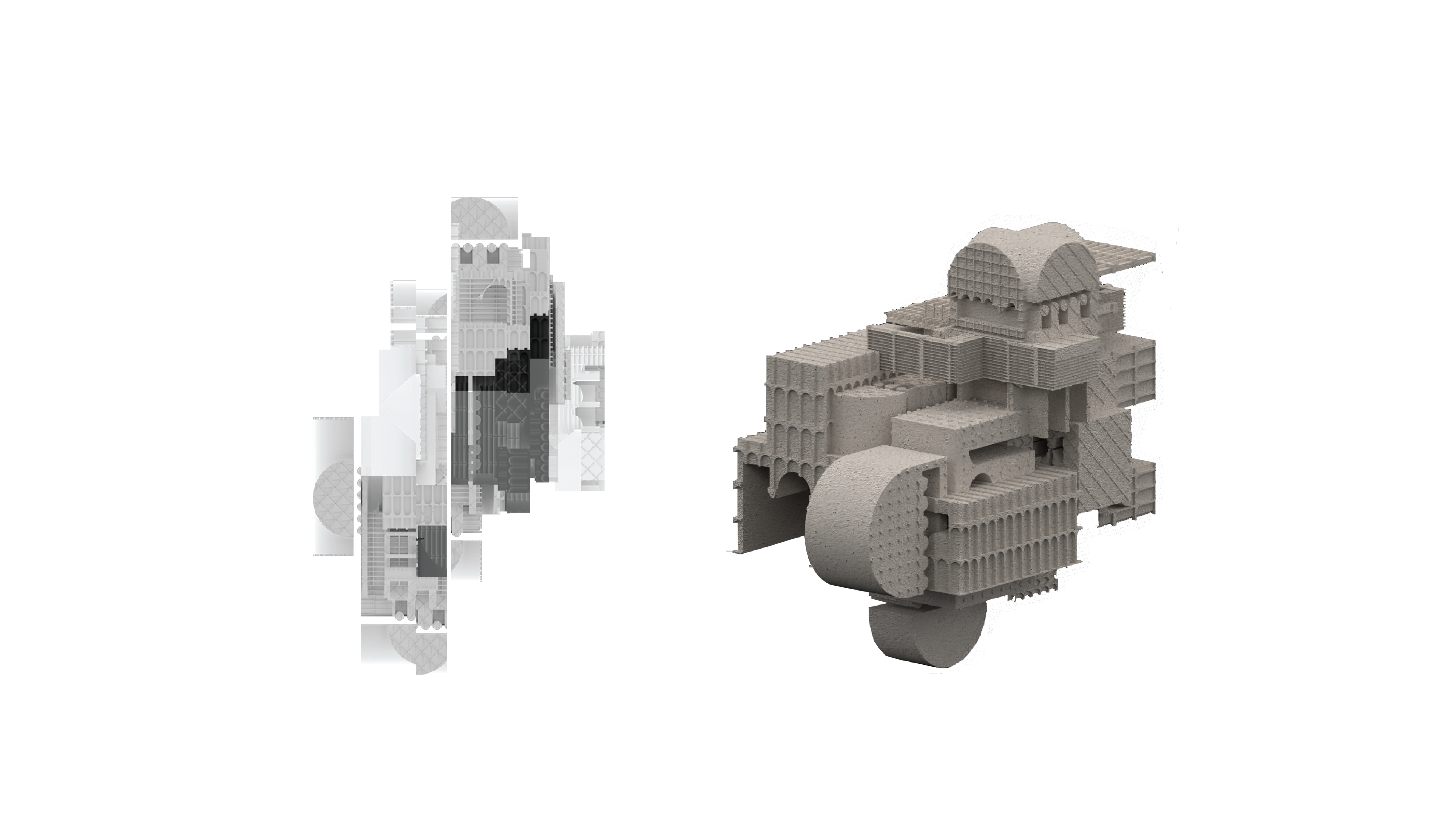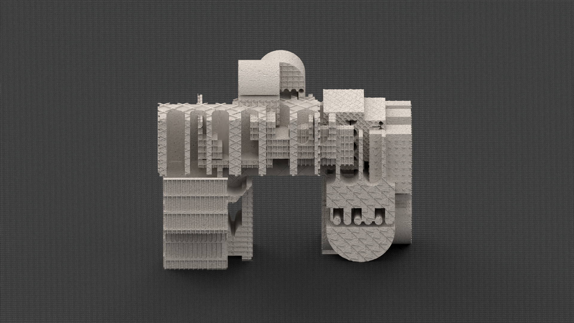 With the ambiguity of the section drawings of Armenian churches, we translated the flat 2D representation into a tool to create exterior elevation geometry. First by transitioning them into line drawings and creating figure grounds and then collaging and creating random shapes for 3D modeling discoveries. By extruding the created figures and collages and creating volumes and exterior elevation geometry that all comes from section drawings of Armenian churches. Taking inside of the churches, mixing and combining them, creating complex geometries and reusing them as an exterior ornaments. It also creates this abougues relationship of the arch with the ground which is usually something standing on top.