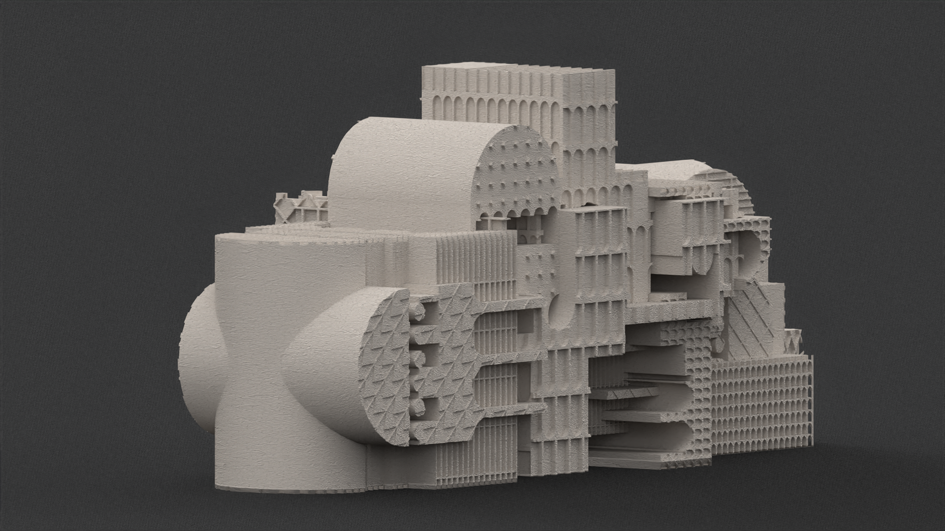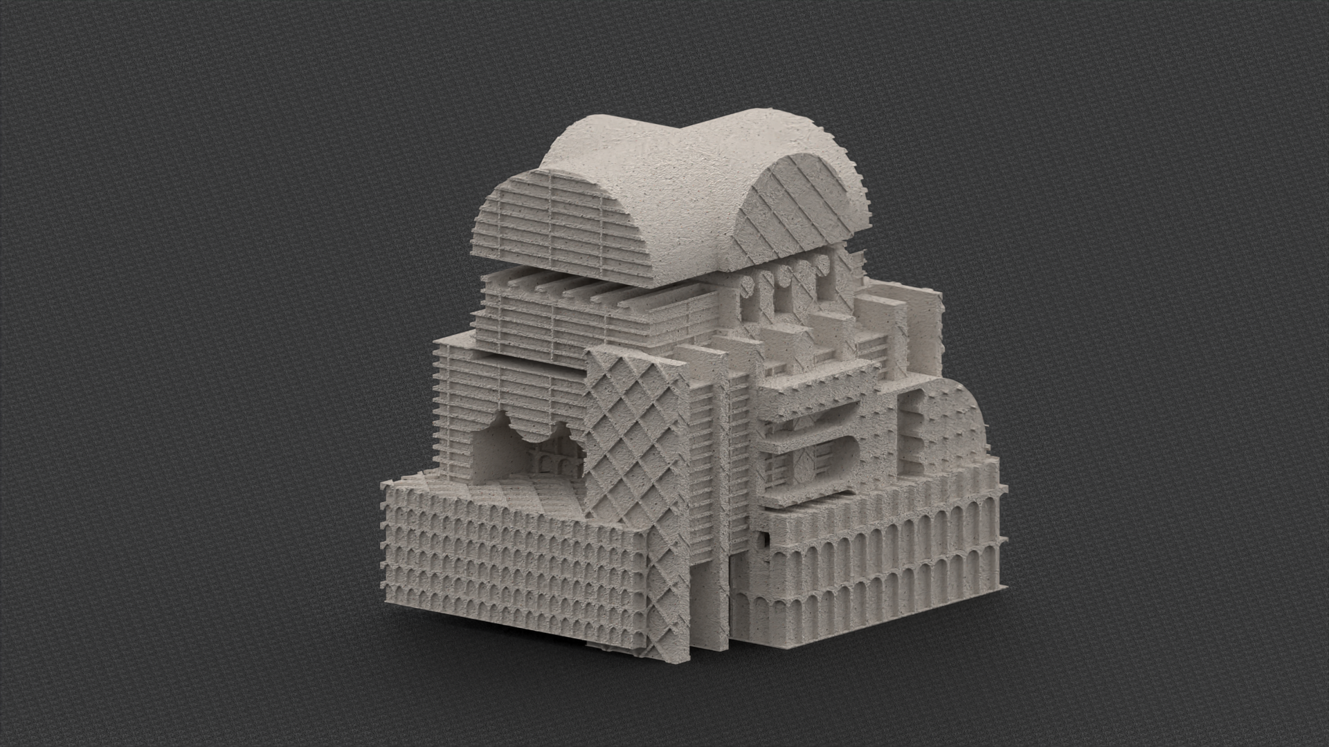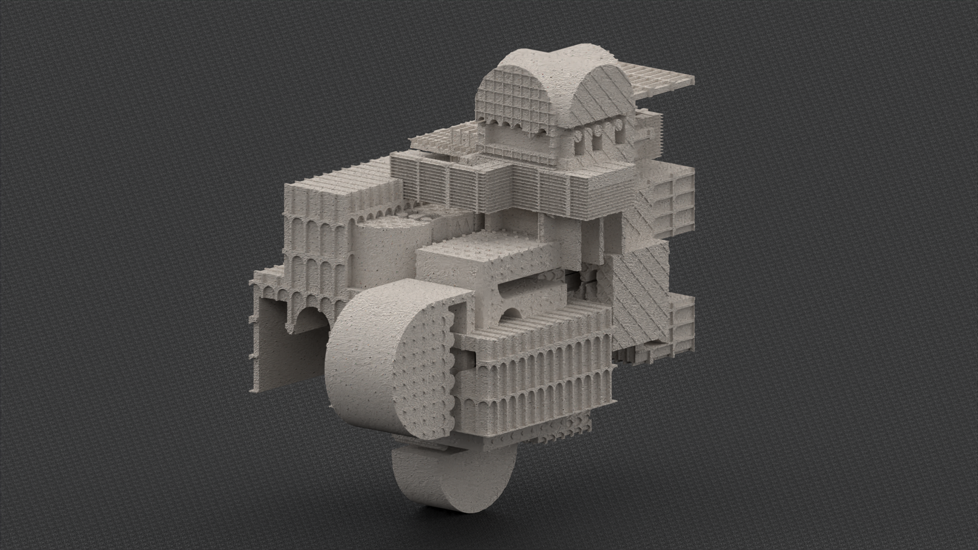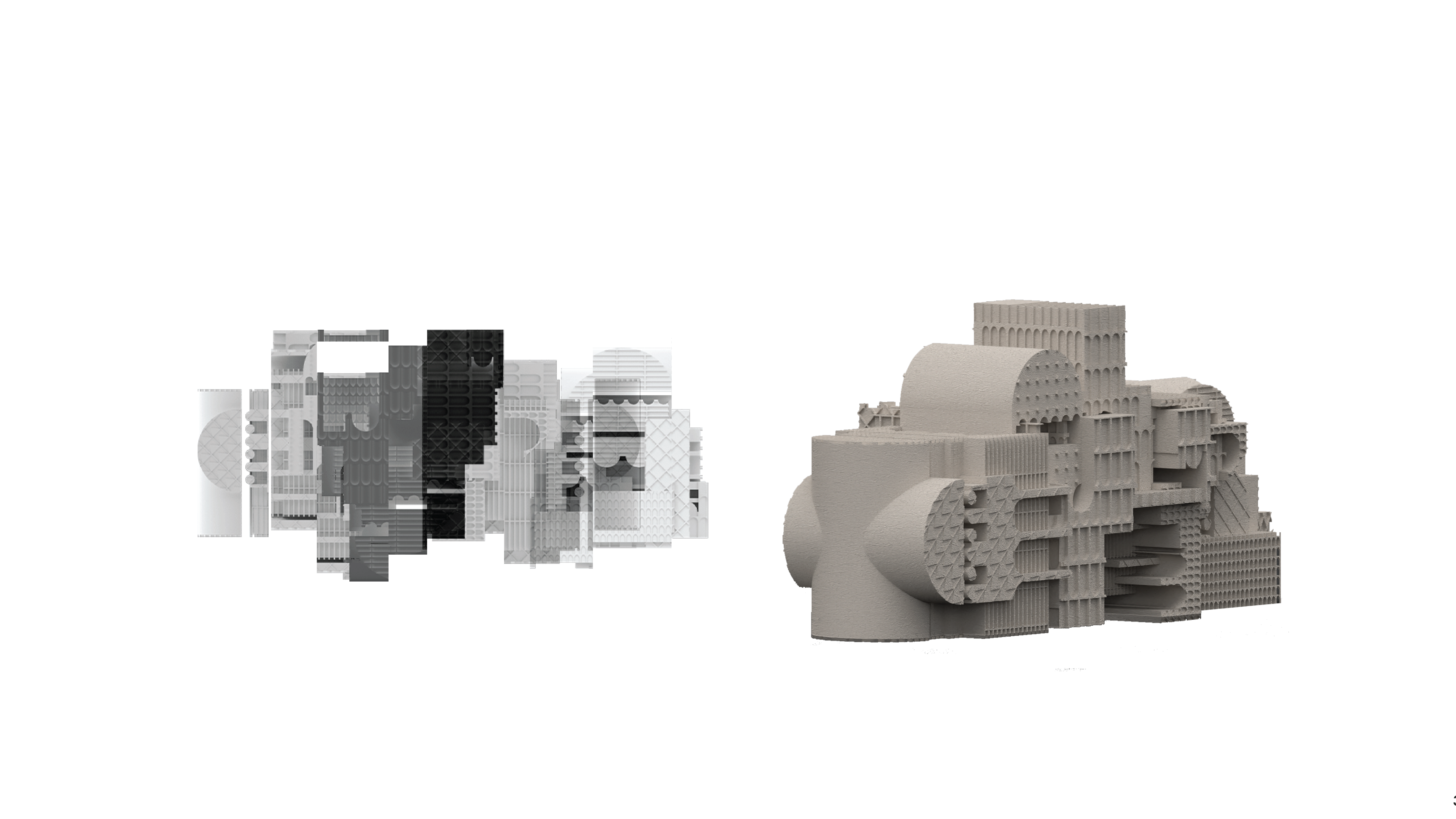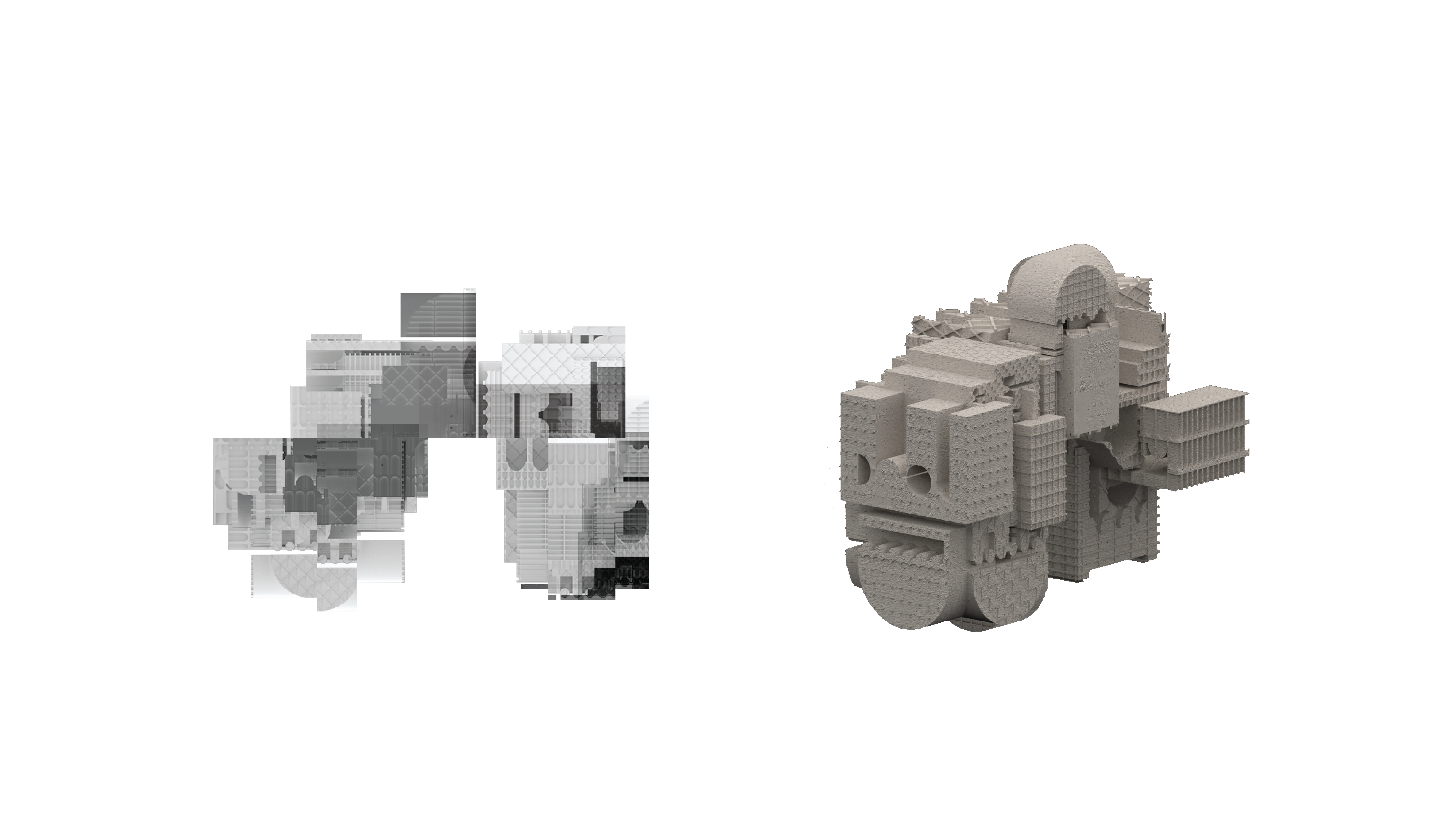With the ambiguity of the section drawings of Armenian churches, we translated the flat 2D representation into a tool to create exterior elevation geometry. First by transitioning them into line drawings and creating figure grounds and then collaging and creating random shapes for 3D modeling discoveries. By extruding the created figures and collages and creating volumes and exterior elevation geometry that all comes from section drawings of Armenian churches. Taking inside of the churches, mixing and combining them, creating complex geometries and reusing them as an exterior ornaments. It also creates this abougues relationship of the arch with the ground which is usually something standing on top.